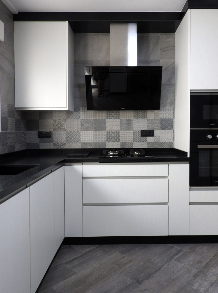 Los muebles están realizados en una terminación estratificado blanco con un cerramiento de color negro que cruza en la parte de la campana. Las puertas tienen una textura que simula madera lo que le da un aspecto satinado más sufrido que contrasta con la encimera y los electrodomésticos negros. Tanto el tirador integrado como algunos detalles son metálicos.