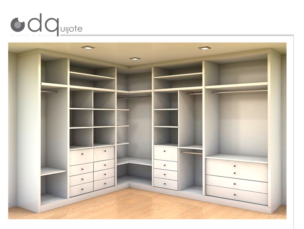 El vestidor en forma de L atiende a la necesidad de guardar los diferentes tipos de prendas y complementos, contando con zonas para colgar ropa larga, corta, pantalones, abrigos , estantes y cuatro cajoneras.