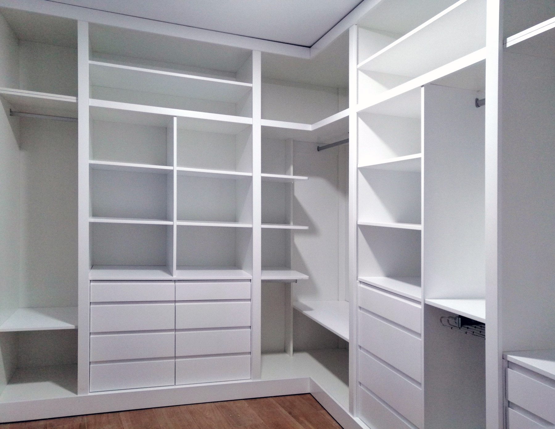 El vestidor en forma de L atiende a la necesidad de guardar los diferentes tipos de prendas y complementos, contando con zonas para colgar ropa larga, corta, pantalones, abrigos , estantes y cuatro cajoneras.