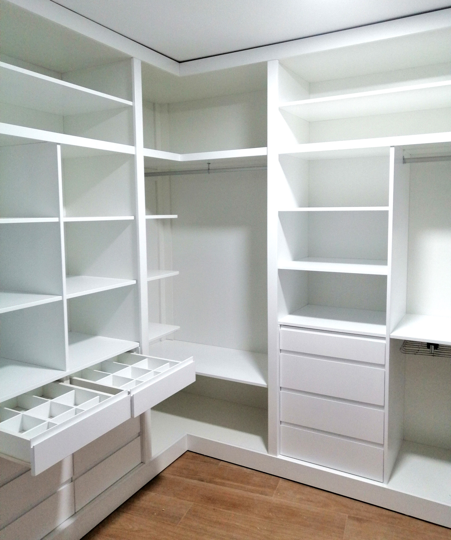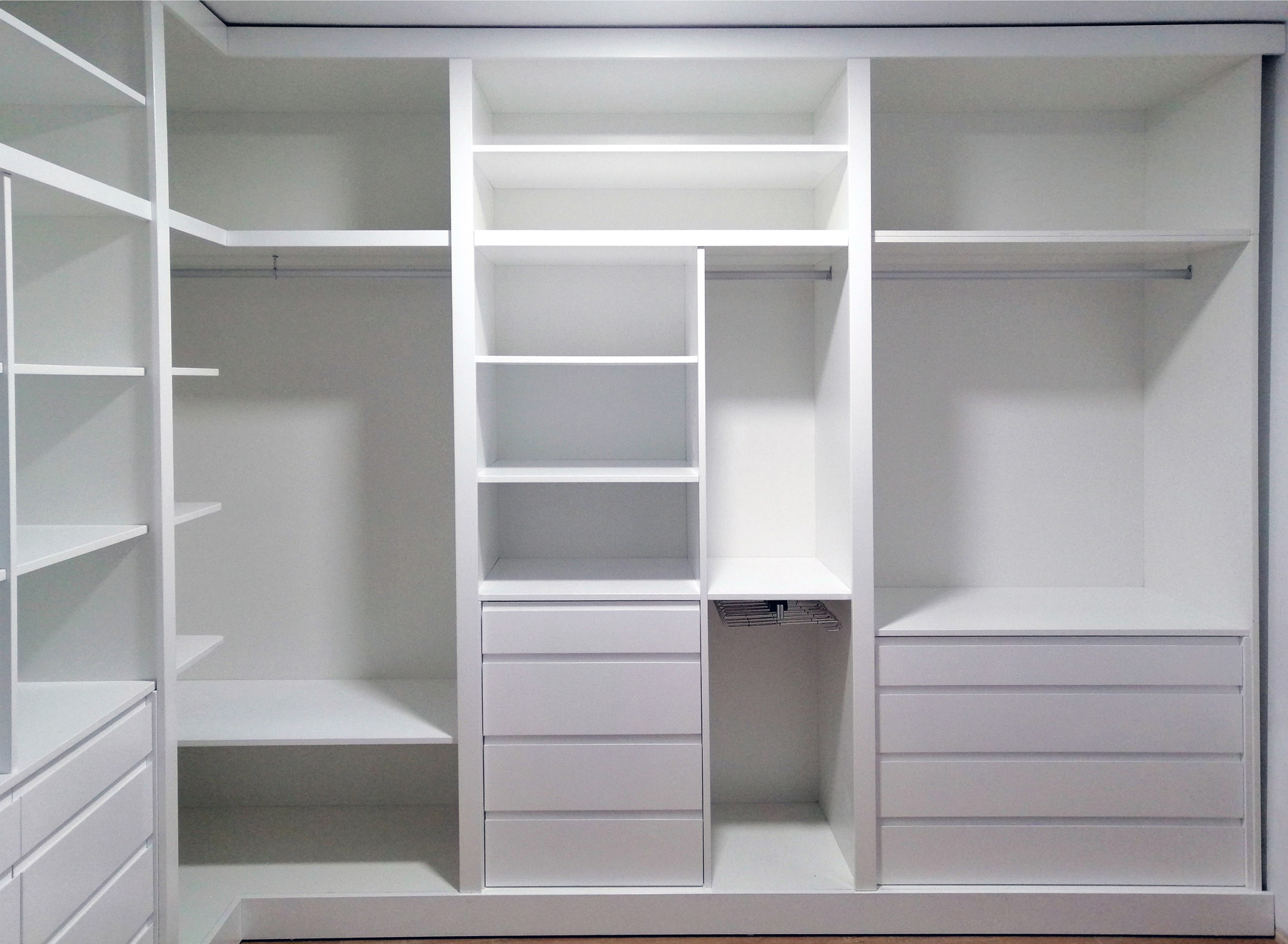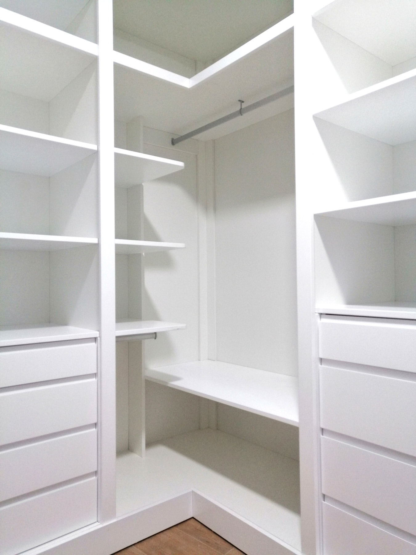 El material que hemos utilizado para realizar los interiores del vestidor ha sido tablero superpan blanco, terminado con frentes de cajón, estantes, moldurones rectos, rodapiés y cerramiento realizados en DM lacado en blanco mate.